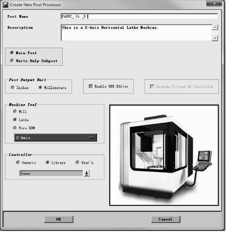 (2)新建一個(gè)后處理。在新建后置處理“Creat New Post Processor”對(duì)話 框 中 ,Post Name 為 FANUC_ 0i _D,輸出單位“Post Output Unit”設(shè)置為米制,機(jī)床類型選擇 Lathe(車床),機(jī)床控制系統(tǒng)從Library中選擇FANUC,如圖2所示,控制系統(tǒng)的選擇非常重要,一定要正確選擇所用數(shù)控系統(tǒng)。